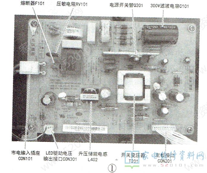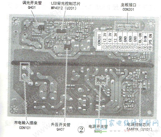 此电源为主板提供的电压只有一路12.3V,通过主板上各DC-DC转换成主板所需的各类电压;为背光电路提供的电压为35V,通过升压转换成56.7V,供LED灯串工作。
