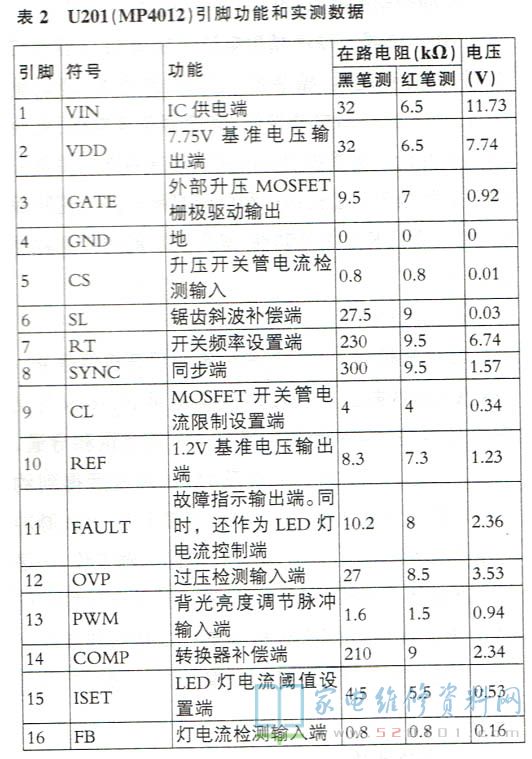 驱动控制电路以MP4012(U201 )为核心构成。MP4012是一块高精度电流控制型LED驱动控制器,内含稳压器、振荡器、逻辑控制电路、驱动输出LED背光灯串电流控制、亮度调整等电路,能为高亮度发光二极管提供8V~90V直流供电,并具有升压电路过流、过压保护和背光灯串开路、短路保护,欠压锁定和热关断功能,其引脚功能和实测数据见表2。