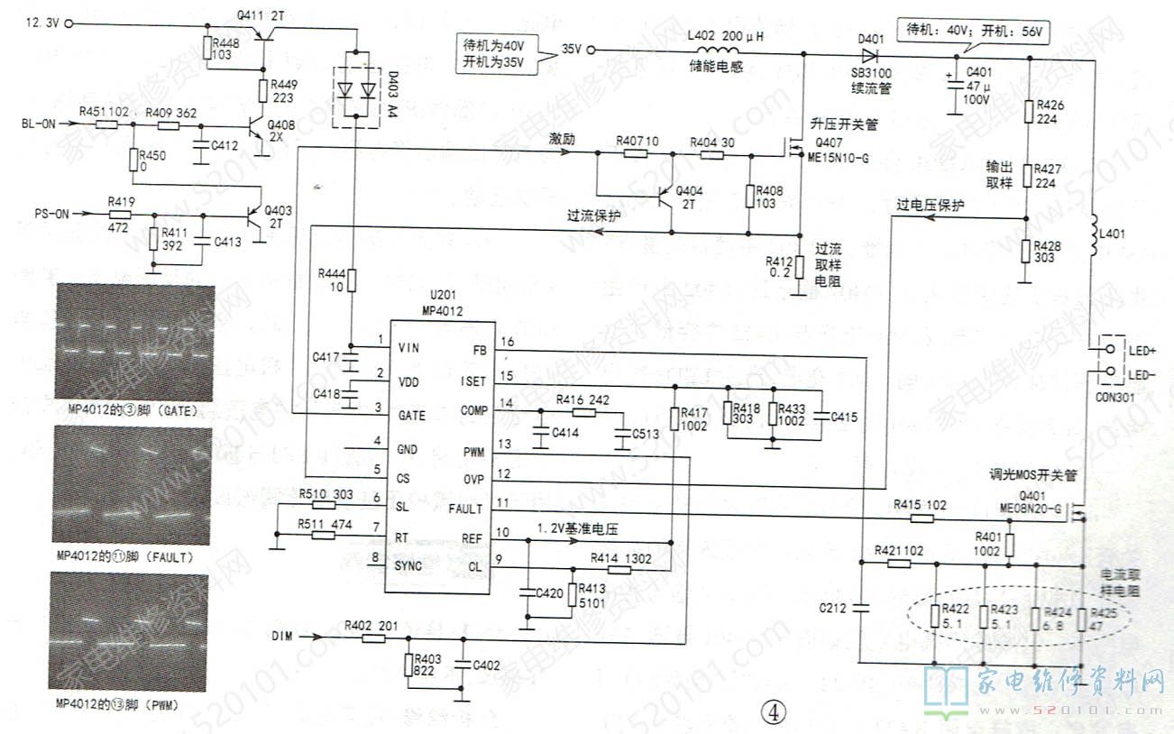二次开机后,U201启动工作,推动Q407工作于开关状态。Q407导通时,+35V电源电压经L402、Q407的D-S极、R412到地,在L402中储存能量,产生左正右负的感应电压;Q407截止时,L402中产生左负右正的感应电压,36V电压与L402中存储的自感电压叠加,经D401向C401充电,产生LED+输出电压,经连接器CON301输出,点亮LED背光灯。