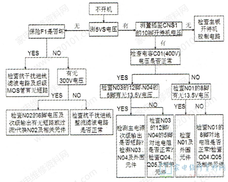 长虹HS280-4N02开关电源该电源适用于长虹26~42英寸的液晶产品,应用于液晶电视型号有:LT37700、LT37810、LT37810U、LT37900FHD、LT40819A、LT40876FHD、LT42876FHD、LT42810FU、ITV42876L等。HS280-4N02电源采用NCP1395+NCP5181+NCP1653A方案。该电源输出四组电压:24V/8A(逆变器供电);24V/3A(伴音供电);5V/3A(小信号供电); 5VSTB/1A( 待机供电)。故障检修框图如图1所示,维修参考电压如表1所示。