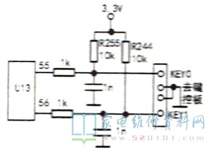 接修一台长虹LT32620A液晶电视,故障表现是本机键控时而正常时而不正常。开始以为是按键板的问题,经查后没有发现故障。测得主板上的键控信号输入端电压时而约为2.8V,时而约为0.5V,电压高时按键正常,电压低时按键失效。检查后发现3.3V的供电有问题,如图1所示。顺着3.3V的供电端向前查,发现该条线路有多个过孔,怀疑过孔不良。找到3.3V稳压块的输出端,用一段引线直接连到键控电路R255.R244的公共接点上,试机故障排除。