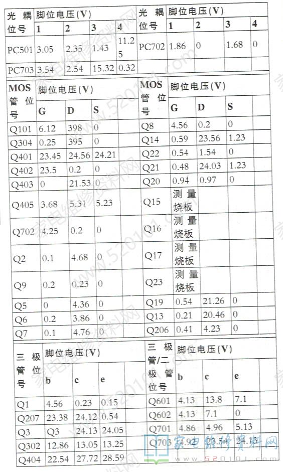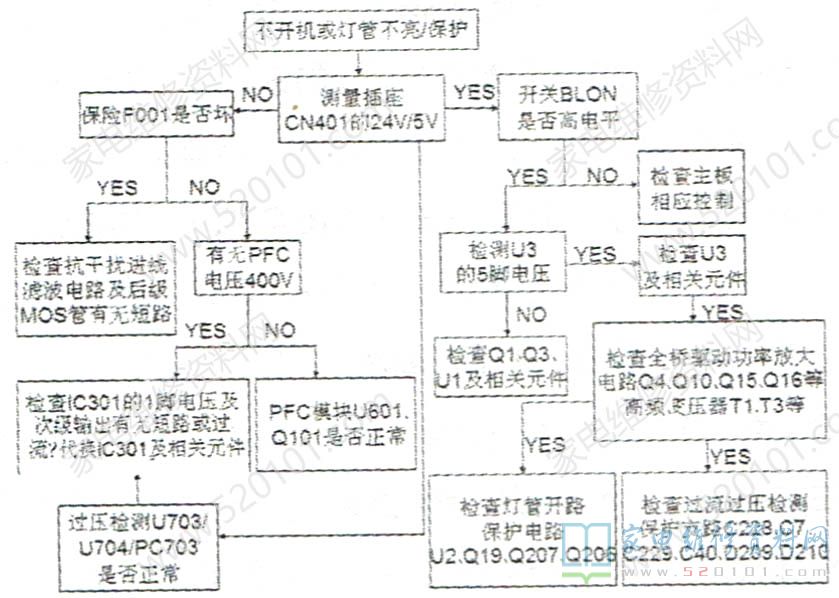 VLC82002.50二合一板是将电源电压形成电路与背光灯逆变电路融合在一起的二合一电源组件,该电源适用于奇美V420H1-LN1屏,整个电源结构排列清晰,具有成本低、便于维修等优点。由于奇美V420H1-LN1屏内共有8根背光灯管,因此VLC82002.50二合一电源组件采用8只高频变压器产生交流高压,分别通过8只插座输出,点亮背光灯管。长虹LS20A机芯中的LT42710FHD机型配备的就是VLC82002.50二合一电源组件,该电源部分分别通过两个插座CN401和CN402与主板连接,其中插座CN401上接收主板送来的开待机控制信号以及输出待机5VS和开机后的5V、24V供电,而插座CN402接收主板送来的背光灯开关控制信号(高点平打开).亮度控制信号、状态控制信号(正常工作为低电平)以及电源部分输出为机芯主板提供的。+24V电压。其故障检修框图如图1所示,维修数据如表1所示。