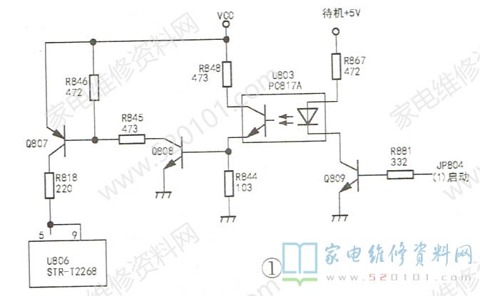 接修一台长虹LT4679P型液晶彩电,突然红灯闪烁,无法启动。机主将其电源板拆下,,送来修理。床t该电源板型号是JUJ7.820.200 U10.0,GP04-1。仔细查看及在线测量大功率管二极管及大电容,未发现明显异常。该电源板与GP03/07/08型电源板电路基本相同,都是用STR-E1565作主电源IC ,输出+5V、+12V;用STR-T2268作副电源IC,输出+24V。在市电输入端串一只100W灯泡后通电,+300V、待机5V均正常,用一只5kΩ电阻连通+5V和JP804的①脚强行启动,无反应。测得副电源启动电压VCC(22V)已到Q807的e极,如图1所示。