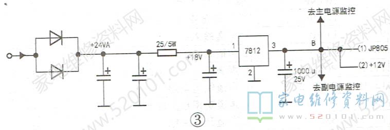 25Ω/5W水泥电阻起限流降压作用,以减轻7812负荷。此路工作电流约0.3A,随音量大小而动,十分安全。另外,需将B处取样点断开,移到A处( +24V),否则电源板将保护。装好后试机,声图俱佳,机主满意。