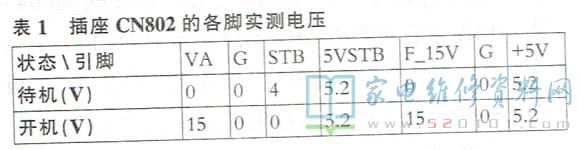 一台长虹3D51C2000型(PS42机芯)等离子彩电,据用户讲:前段时间二次开机后,约20分钟后才能出现图像、声音,现在一直不出现图像、声音。通电试机,红灯亮,接着屏闪亮一下后进入待机状态;遥控二次开机,红灯灭后又亮,并闪烁三次后熄灭,屏又闪亮一下,几十秒后指示灯亮了又灭,如此反复,始终无法开机。拆开后盖,仔细观察各板上元件,未见异常。测量主板上插座CN802的各脚电压,见表1。