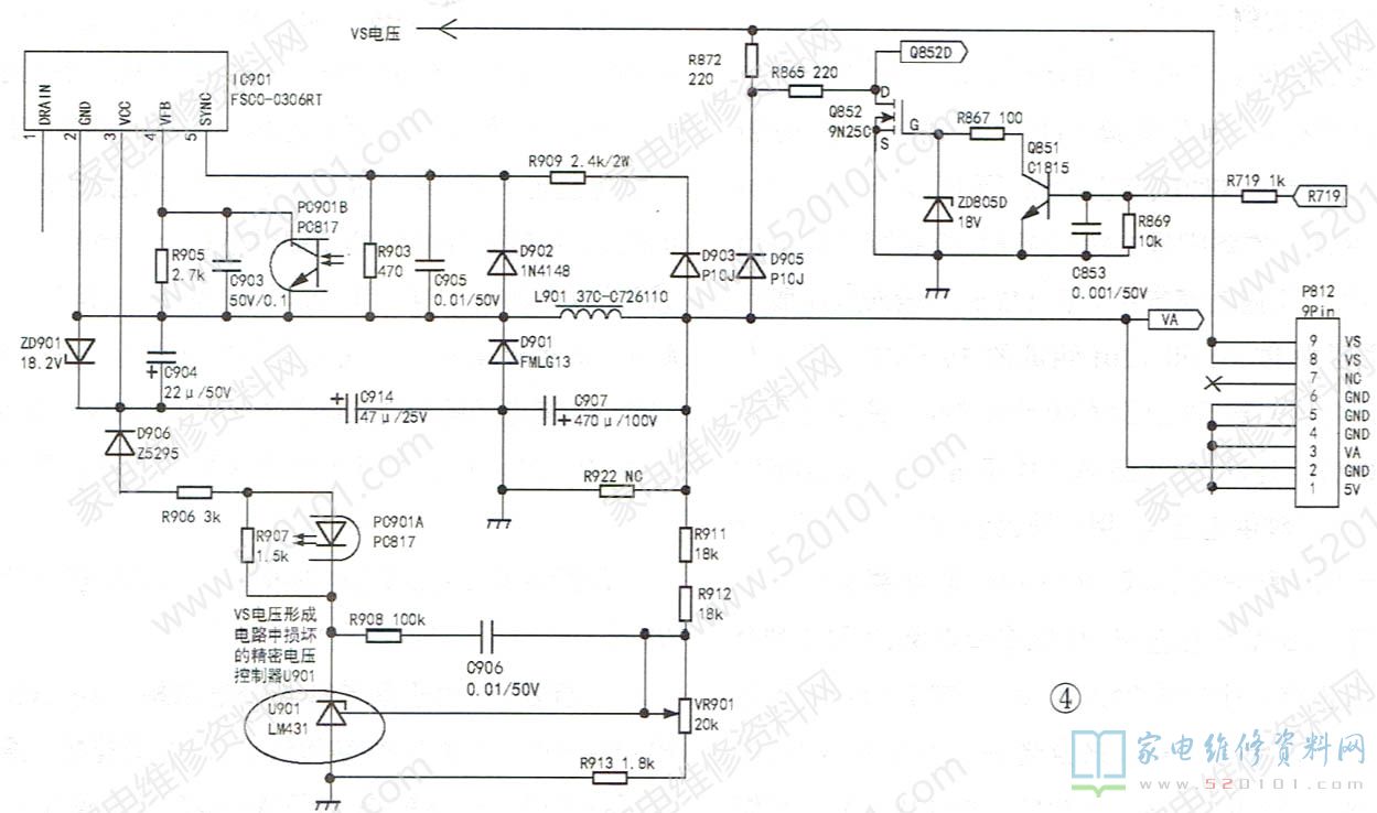 故障现象3:无vS电压输出,指示灯亮一下就熄。分析检修:由于是单独维修电源板,所在vS输出端接一一个100W的灯泡作假负载,以便观察。通电发现指示灯亮一下就熄,检测VS电压没有输出。短接pPC151的③、④脚和PC152的③、④脚,通电测量PFC电压正常,而开机瞬间测量VS能升至90V左右。进一步检测VA电压发现有117V,明显偏高(正常应该为69V),代换IC901,故障依旧,再代换U901(KIA431 )后故障排除,相关电路如图4所示。