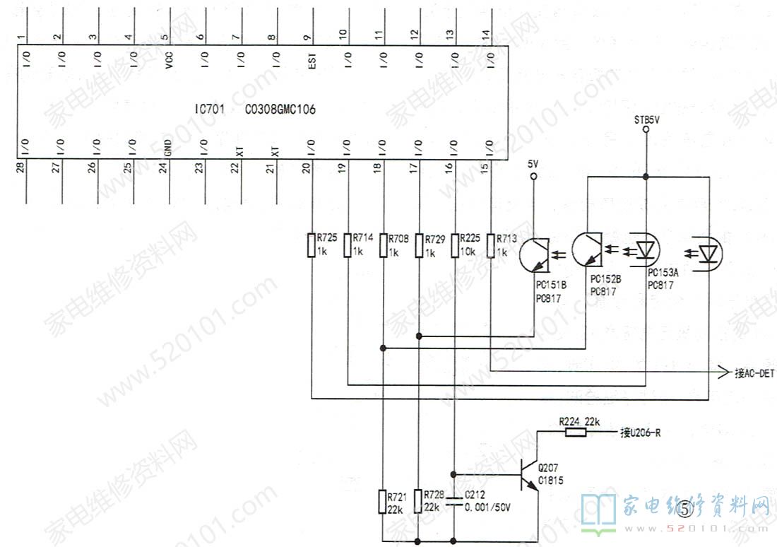 (1) 如果没有待机STBY5V输出,可把光耦PC151的次级③、④脚短接,即③脚强行接高电平5V,而后送至MCU( IC701 )的17脚进行交流输入检测,去掉待机保护,若有待机STBY5V输出的话,说明是该保护电路出现故障,否则就是待机STBY5V形成电路出现故障,从而进一步 检查此电路相关元件即可。