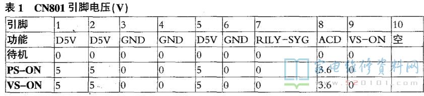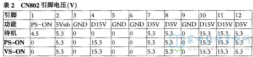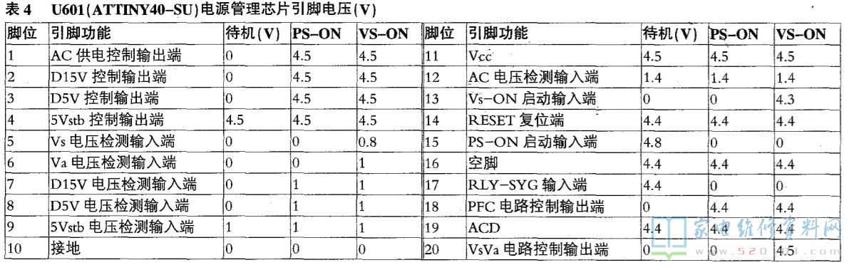 表1~表3为电源板输出引脚电压,表4为电源管理芯片U601引脚功能及实测电压。
