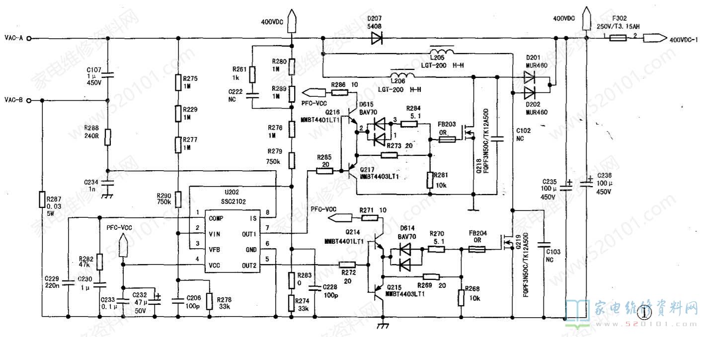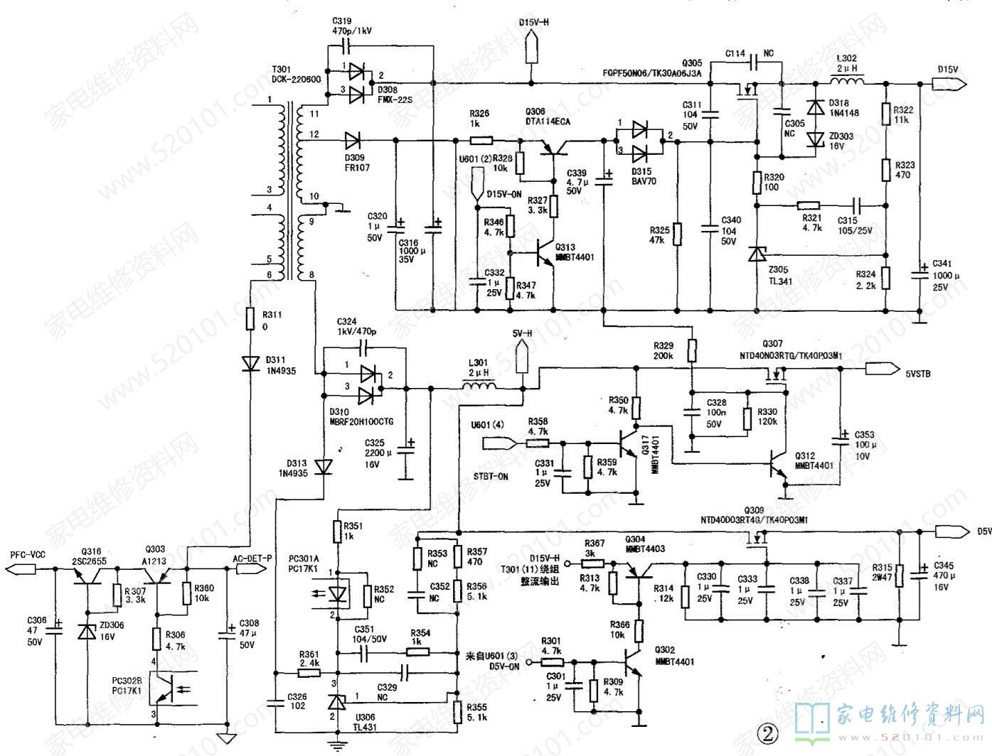 在网上一通搜索,发帖求助寻找图纸,网友只提供了相似的HS300B-5HF02电源板电路图,两者主要差别在电源管理芯片U601不同。经整理和测绘本机R-HS310B-5HF01电源板图。