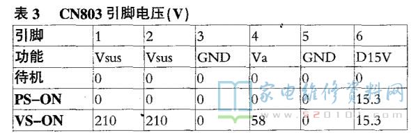 一台长虹3D50A600iV型等离子电视(PD38机芯),接通电源后,红色指示灯亮,同时听到机内继电器反复吸放“嘀嗒嘀嗒”声,电视机无光无声。该机电源板型号为R-HS310B-5HF01(长虹欣悦产品)。检查CN801、CN802、CN803输出插脚,发现接通电源后随着继电器“嘀嗒”有节奏的发出声响,D5V和D15V输出端电压也不停地从有电压变为没电压再变为有电压,且5V和15V两项输出电压瞬间电压超过额定输出值的50%。其他输出端,包括5Vstb输出电压始终为0V,这与一般的等离子电源首先输出5Vstb,然后经启动PS-ON端后,D5V、D15V等端口才有输出的工作方式显然不同,有明显故障。