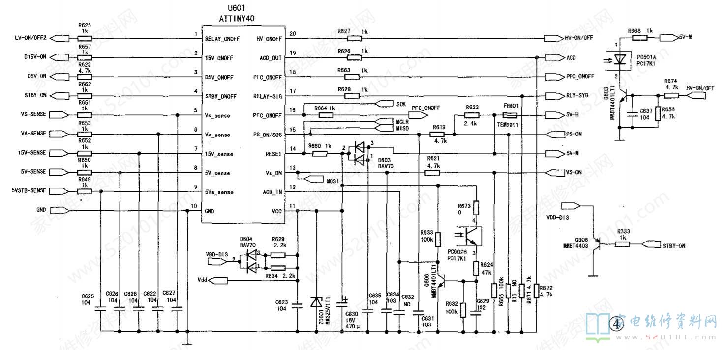 图1为电源板PFC供电电路图,振荡控制块为SSC2102。图2为电源板低压形成电路中T301次级各低压供电电路图。低压形成电路由NCP1271、变压器T301等组成。这些电压的输出受U601控制。图3为Va、Vs高压供电电路图,此电路由NCP1393组成。图4为电源管理芯片U601( ATTINY40-SU)电路图。该板工作原理与其他品牌型号等离子电源板基本一致,在此不再赘述。