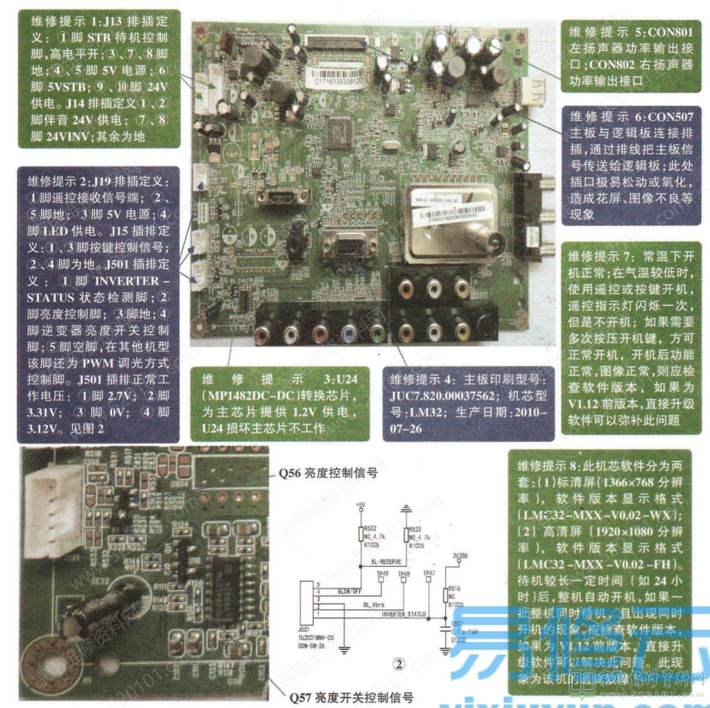 长虹电视JUC7.820.00037562主板属于长虹LM32机芯,代表机型有LT32710X、LT32710、LT32719、LT32719A、LT37710X、LT37710、LED23860X等,主板采用MTK8223LFMU主芯片作为该机芯的核心模块。基本功能包含1路RF、2路AV输入、1路s-VIDEO输入、1路YPbPr输入、1路VGA输入、1路USB输入、1路HDMI输入和1路AV输出;最重要的一点采用15针的RGB终端可以直接连接笔记本电脑作为大屏显示器使用。该机主板配的屏种类繁多,更换主板时一定要找对屏的型号,因为不同的屏配的主板一样,而刷写的程序不同,如果不匹配会出现花屏、开机异常、烧坏屏的逻辑板和驱动板等现象,所以不可小视。