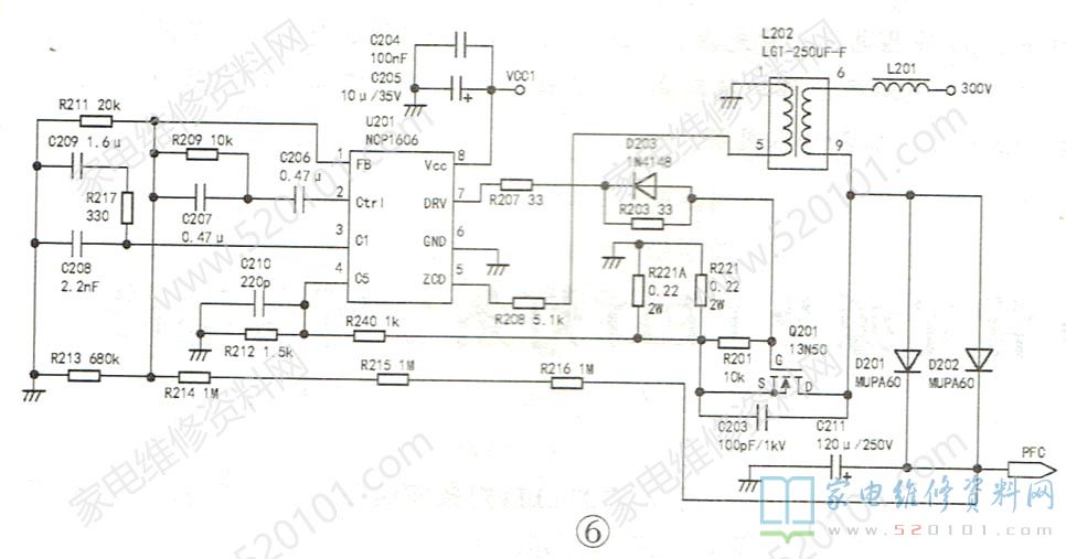 例3:二次开机后,有时屏幕能亮,有时指示灯闪烁几下就黑屏。分析检修:通电测得待机5Vstb及主电源5V、24V电压均正常,但PFC电压只有365V,正常值应大于380V,判断故障在PFC电路中,相关电路如图6所示。二次开机后,Q301导通,输出vCC1电压给U201(实装NCP1607B )的⑧脚,U201启动工作,从⑦脚输出驱动脉冲信号,使Q201工作在开关状态。当Q201导通时,电感L202储能;当Q201截止时,L202通过D201和D202给C211充电,最后在C211 上形成380V~400V的PFC电压。N201的引脚功能与参考电压见表2。PFC电压高低由U201①脚电压控制,①脚电压越低,输出电压就越低。拆下U201①脚外接电阻R214~R216,先清除其底部粘胶,再用吹风机吹干PCB板,最后再装上这几只电阻试机,故障排除。