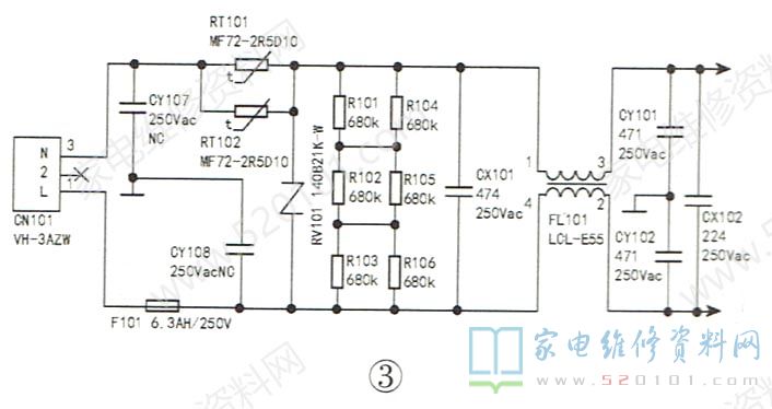 例1:三无,指示灯不亮分析检修:用户说,头天晚上看完电视后遥控关机,第二天就成这样。拆机检查,发现保险管F101已断路,于是首先检查市电输入电路。220V市电通过负温度系数抗浪涌电阻RT101、RT102送给整流桥BD101整流,如图3所示。