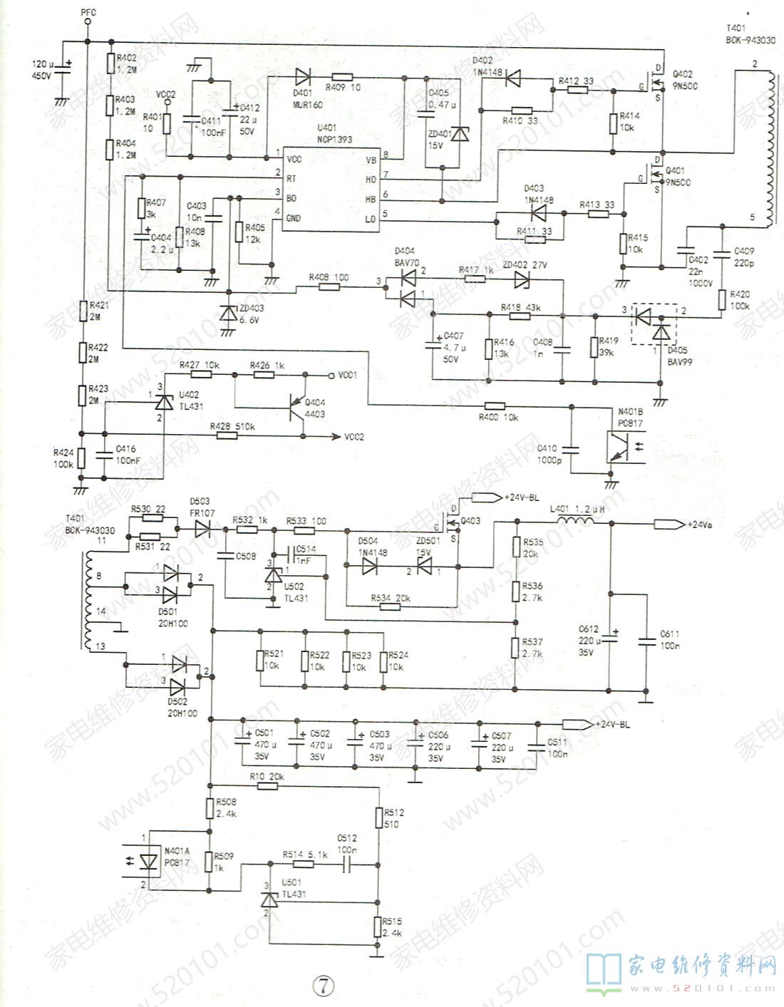 例5:背光闪烁。分析检修:通电测得电源板输出的24V电压明显不足,只有20V,这就是造成背光闪烁的原因。测得PFC电压为385V,正常,于是重点检查由U501(TL431)及光耦N401等元件组成的24V稳压电路。代换U501后故障依旧,测得U501控制端外接电阻均正常拆下电容C512检查,发现其漏电,换新后故障排除。由于C512漏电,则流过光耦N401①、②脚间的电流增大,在U401的控制下24V输出电压降低。