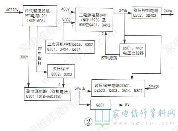 例4:黑屏。分析检修:通电测得PFC电压为正常值386V ,5Vstb待机电压也正常,但无24V电压输出。强制开机,仍无24V电压输出,判断故障出在主电源电路中。该机的主电源电路如图7所示。