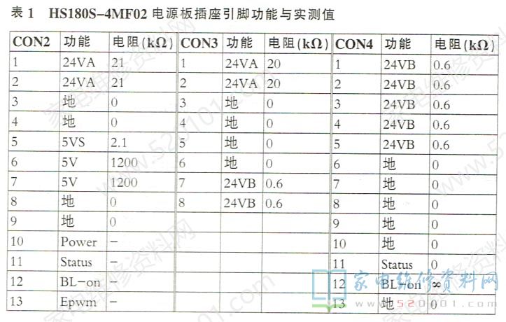 在单独检修该电源板时,可用一只1kΩ电阻连接插座CON2的⑤脚(5VS )和Power端①脚,并在24VA端上接上假负载,通电后测量各组输出电压是否正常。摘板检修时,笔者用DT-890B型数字万用表测得正常电源板上插座各脚对地正向电阻(黑表笔接冷地,红表笔测量)见表1,供参考。