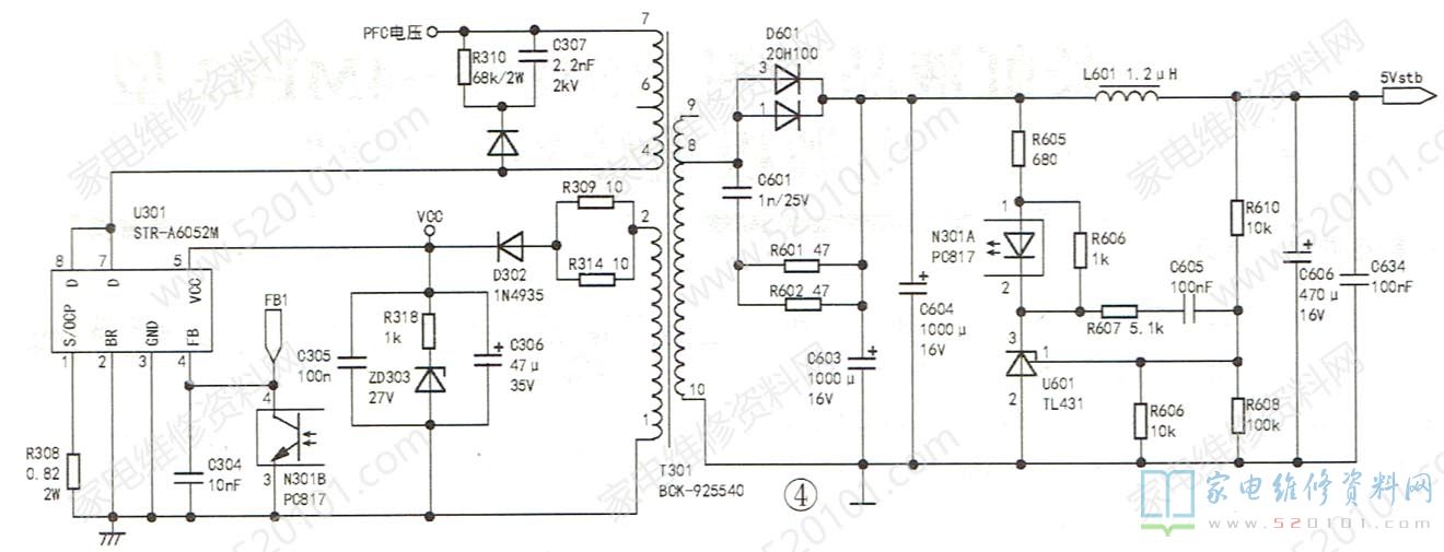 例2:三无,指示灯不亮。分析检修:测得300V电压正常,但待机5Vstb电压为0V。断开5Vstb负载,待机5V电压仍为0V,由此判断故障在副电源电路中。副电源电路由U301 (实装STR-A6059H)、T301(BCK-925540 )和三端稳压器U601(TL431 )等元件组成。整流滤波所得300V电压通过T301的⑦-④绕组加到STR-A6059H的⑦、⑧脚。T301的①-②绕组感应电压经D302整流后给STR-A6059H的⑤脚供电,如图4所示。