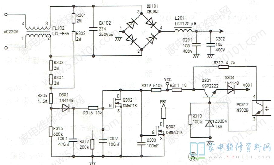 若5Vstb电压偏高,光耦导通电流变大,STR-A6059H的④脚电压降低,通过内部PWM控制,实现稳压的目的。二次开机后,Q605导通,P沟道场效应管Q601导通,5Vstb电压通过Q601输出5V电压,供给主板上的小信号处理电路。本电源还设有市电欠压保护电路,如图5所示。当市电欠压时,R301~R305和R315的分压值减小,Q302截止,Q303导通,U301的④脚接地,U301停振,从而起到欠压保护作用。测量U301的⑧脚电压,为正常值300V。断电后在路测量U301各脚电阻,发现④脚电阻只有0.8 kΩ,而正常值应大于3MΩ。拆下N301(PC817)测量,发现其③、④脚漏电,换新后故障排除。由于N301③、④脚严重漏电,导致U301④脚电压降低,U301停振,从而没有待机5V电压输出。