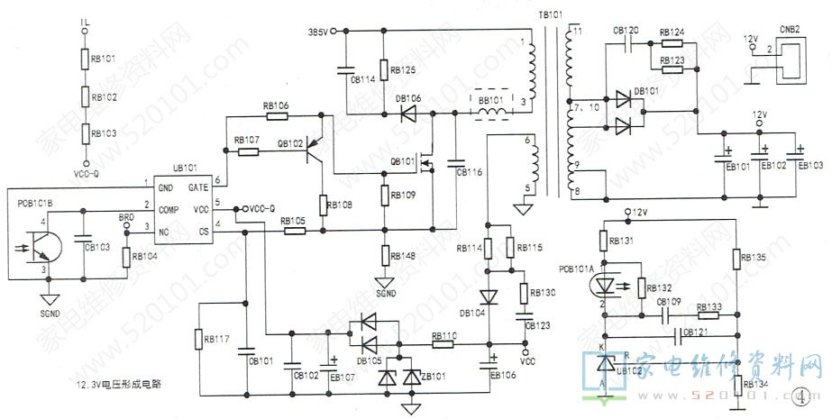 当有交变的电流流过TB101的①-③绕组时,TB101的次级绕组均会产生相应的感应电压。TB101次级⑤-⑥绕组感应的电压经RB114.RB115限流,DB104整流,EB106滤波后,形成vCC电压,再经RB110限流、ZB101(24V)稳压.DB105隔离后加到UB101的⑤脚,为UB101提供正常工作电压。TB101次级⑨-①绕组产生的感应脉冲经DB101整流EB101~EB103 滤波后,形成12.3V的直流电压为主板电路供电。