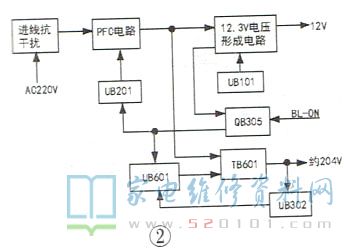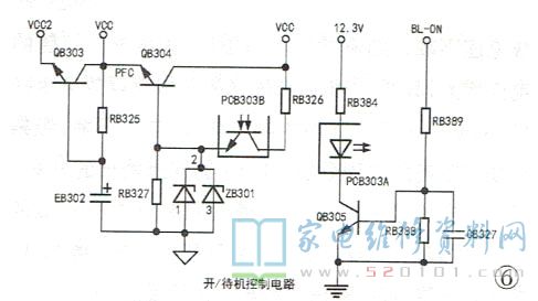 UB101内置欠压保护电路(UVLO),当检测到⑤脚(vcc)电压小于7.5V时,芯片就会进入欠压保护状态,关闭⑥脚驱动脉冲信号输出。3.开/待机控制电路开/待机控制电路主要由QB303 ~QB305、PCB303等元件构成,如图6所示。待机时,主板送入的BL-ON信号为低电平,QB305截止,PCB303内部的发光二极管不发光,PCB303内部的光敏三极管不导通,QB304截止,vcc PFC电压为0V,功率因数校正电路不工作。二次开机后 ,BL _ON信号变成4.6V高电平,QB305饱和导通,PCB303内部①、②脚的发光二极管发光,③、④脚光敏三极管导通,由于QB304、ZB301(15V稳压管)等元件组成的稳压电路工作,输出稳定的14.8V电压(VCC_ PFC),为功率因数校正电路供电。