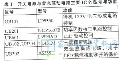 该机芯彩电的开关电源与背光驱动电路框图如图2所示,主要IC的型号与功能见表1。