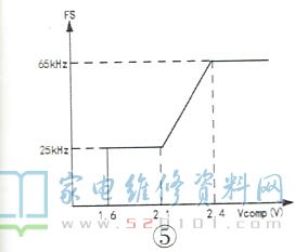 本电路主要由UB102(TL431 ).PCB101.UB101及相关外围元件构成,通过光耦PCB101控制UB101的COMP端子输出电流的多少来实现输出电压的稳定。电视机正常工作后,功率因数校正电路进入正常工作状态,输出稳定的PFC电压(385V),同时,12.3V电压负载因整机进入正常工作状态而加重,输出功率增加,经稳压环路处理后UB101的②脚输出电流减小,电压上升,在内部电路检测到②脚电压高于1.6V后,芯片进入正常工作模式。UB101 的②脚电压与工作频率关系如图5所示。