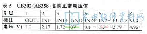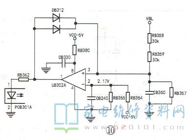 VBL电压(即LED+电压)经RB358.RB359和RB357分压后加到UB302的③脚。CB350是干扰滤除电容,防止误保护。同时,vCC-5V电压经RB354和RB355分压得到约2.17V电压,加到UB302的②脚。正常工作时,VBL电压在180V~228V之间,分压后加到UB302的③脚电压低于2.17V,则UB302的①脚输出低电平,不影响背光驱动电路正常工作。当负载开路或接触不良等原因造成VBL电压过高时,UB302的③脚电压也跟着升高,当③脚电压达到2.18V时,UB302的①脚输出高电平,光耦PCB301内部发光二极管发光,其③、④脚内部光敏三极管导通,vcC2电压经RB605、PCB301.RB607送入UB601的⑧脚,如图8所示。当⑧脚电压升到1.85V时, UB601进入关断状态,15脚和11脚一直输出低电平,LED驱动电路进入保护状态。正常工作时,UB302的各脚电压见表5。