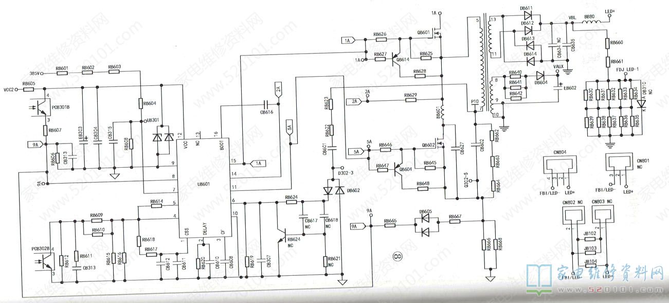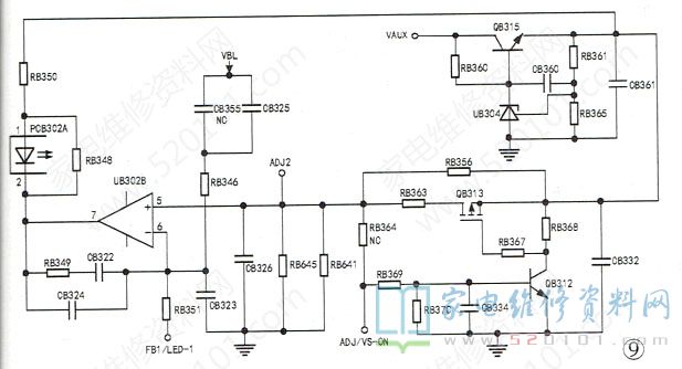 VAUX电压经QB315和UB304及外围元件组成的稳压电路,形成vCC-5V电压,为比较器UB302(AS358 )供电。当某种原因造成LED+电压升高时,流过LED背光灯串的电流增加,则FBI/LED-电压上升,即UB302的⑥脚电压升高,若超过⑤脚电压(由电阻RB363和RB341/RB345分压得到),UB302的⑦脚输出电平变低,光耦PCB302的①、②脚内部的发光二极管发光增强,其③、④脚内部的光敏三极管等效电阻降低,即UB601的④脚外接电阻的阻值下降,UB601内部的振荡频率上升,谐振电路输出功率下降,LED+电压降低,流过LED灯串的电流下降。当某种原因造成LED+电压降低时,其稳流过程与上述相反。