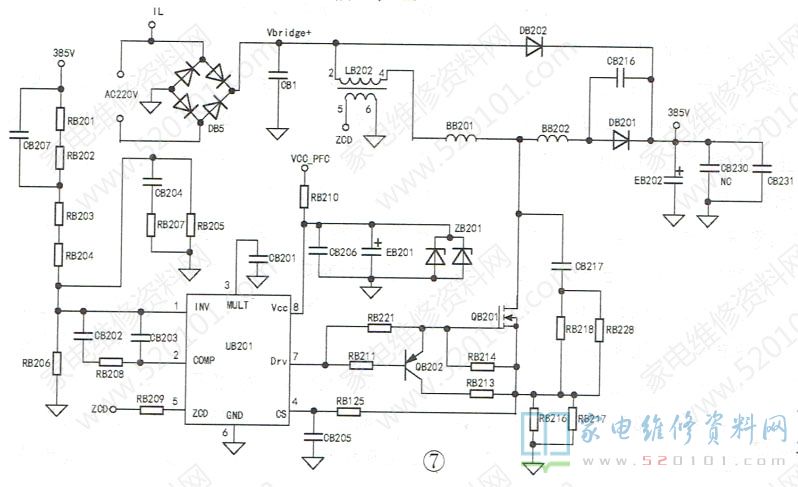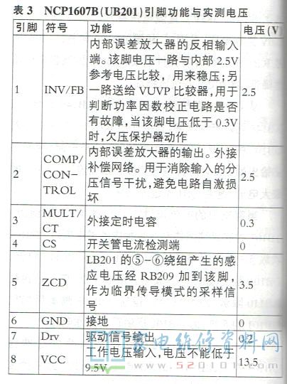 本机PFC电路采用安森美公司生产的PFC控制芯片NCP1607B( UB201 ),如图7所示。