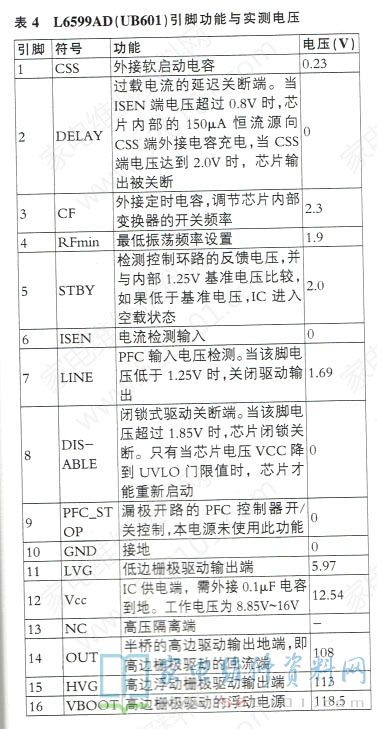 LED背光驱动电路使用LLC驱动控制块L6599AD( UB601),如图8所示,其引脚功能见表4。