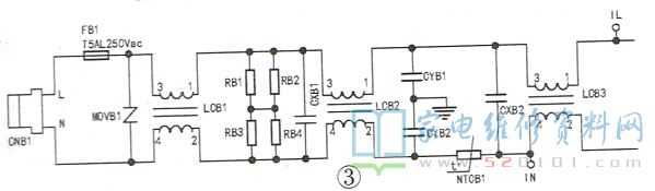 电路由LCB1~LCB3及外围电路组成三级滤波网络。LCB1~LCB3是共模线圈,组成三级共模滤波网络,滤除电网或电源产生的对称性干扰信号。CXB1.CXB2组成不平衡滤波网络,滤除电网或电源产生的不对称干扰信号。电路中,CYB1和CYB2是安全电容,对耐压值和漏电电流要求很高,容量大小对电视机漏电电流和悬浮电压有较大影响,在维修中不可随意改动。