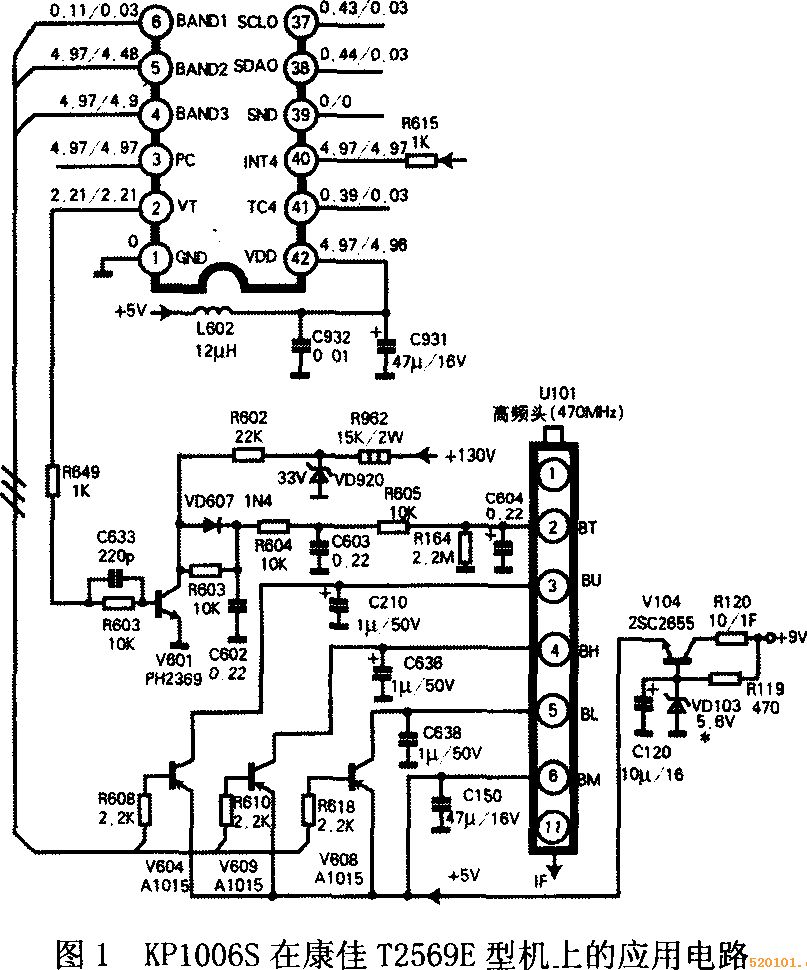 发现供电是通过V104(2SC2655)、VDl03有源滤波器产生5V的,同时供高频脚5V,