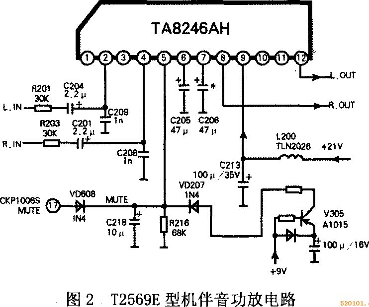 用数字表冷机测量高频头脚电压5.01V,BL段5V,BH段0.1V,故障出现时5V电压上升到5.13V,BH上升2.5V,BL段无图像,测V104的基极电压由5.6V上升到5.73V,更换VDl03稳压二极管、图像正常,BL段图像不再漂移(参见图1带*号元件)。检查伴音电路,伴音信号已送到功放块。TA8246AH②、④输入脚、⑨(电源供电脚)21V电压均正常。正想更换功放块时,万用表表