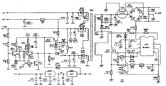 IC801.工作后,开关管导通,C812开始放电。当C812两极电压下降至1 0V时,IC801⑤脚停止输出激励信号,开关管截止,进入锁定期。T803次级各绕组向各整流网路提供工作电压与电流。