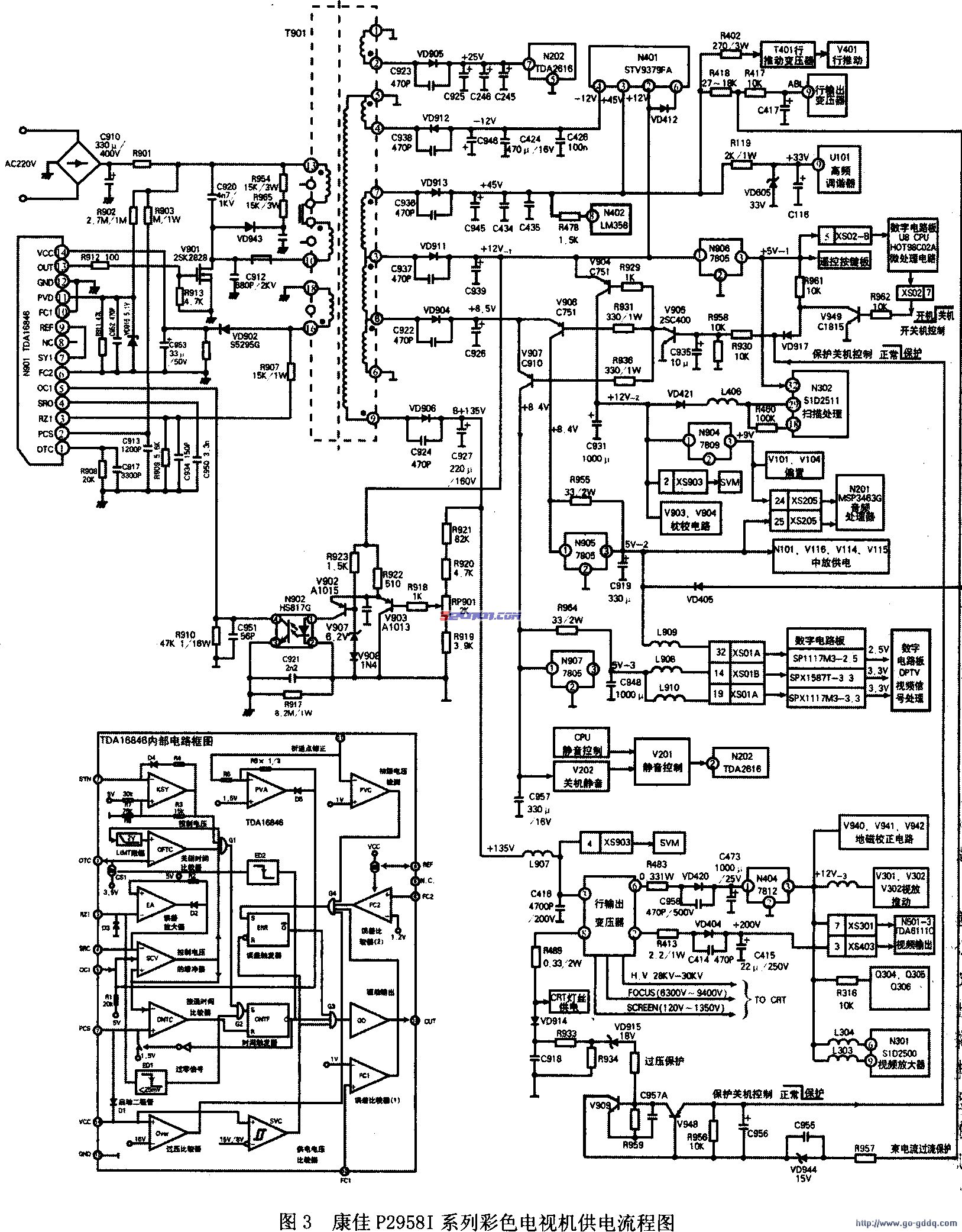 康佳P29581系列彩电分析-康佳P2958I系列彩电供电流程分析 2008-01-04 10:59:57 阅读 486 次 评论 0 条 摘要: 康佳P2958I系列彩电的供电流程如图3所示。由图3可见本机的供电系统由交流输入整流电路、开关电源控制输出电路、开关变压器次级整流输出电路、受控稳压直流输出电路、行输出变压器整流稳压输出电路、开/待机控制与保护关机控 康佳P2958I系列彩电的供电流程如图3所示。由图3可见本机的供电系统由交流输入整流电路、开关电源控制输出电路、开关变压器次级整流输出电路、受控稳压直流输出电路、行输出变压器整流稳压输出电路、开/待机控制与保护关机控制等电路组成,本文根据图3对其主要电路供电流程进行简要分析说明。 版权声明:本文为转载文章,版权归原作者所有,欢迎分享本文,转载请保留出处! 点赞 分享: PREVIOUS:康佳P29581系列彩电分析-数字音频信号处理电路特点 NEXT:康佳P29581系列彩电分析-开关电源输出控制电路 文章导航