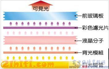 一般15吋和17吋的显示屏中每组灯管是2根固定在一起(共4根);20吋显示屏是每3根固定在一起(共6根);23吋以上的灯管大多数是排列式平摆放(LC-TM3008配奇美屏的灯管有16根、TM3719配奇美屏的灯管有20根)。另外,早期生产的15吋液晶电脑显示器(康佳未生产有),其显示屏内的灯管只有2根,因此光的亮度会略暗于现在的液晶彩电的显示屏。