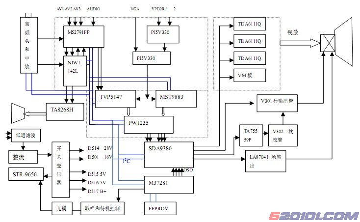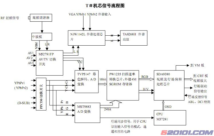 数字信号处理板中将模拟电视信号采用TVP5147彩色解码和A/D变换芯片,YPbPr信号采用高速A/D变换芯片MST9883或AD9883,数字信号处理芯处采用美国Pixelworks公司的变频处理PW1235,它将输入的各种模式的信号统一变换成1080i/60Hz的扫描格式,然后将RGB三基色和HV同步信号送经SDA9380视频和行场偏转处理芯片,进行模拟量,白平衡,自动亮度控制和自动白平衡处理。