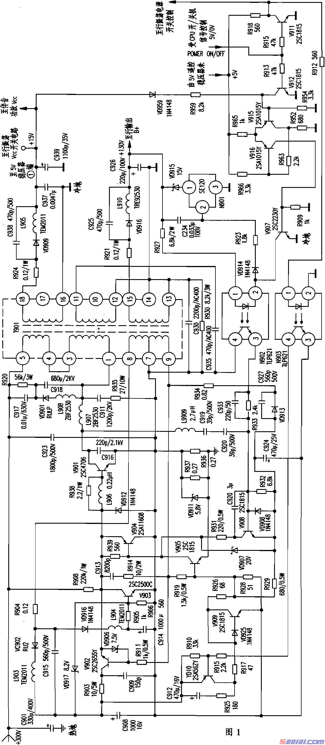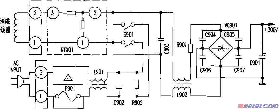 流滤波部分(参见图2),包括进线净化共模滤波器L901、L902,桥式整流堆VC901,滤波电容C901;2.开关电源振荡电路;3.稳压控制环路;4.恒流激励电路;5.遥控关机电路;