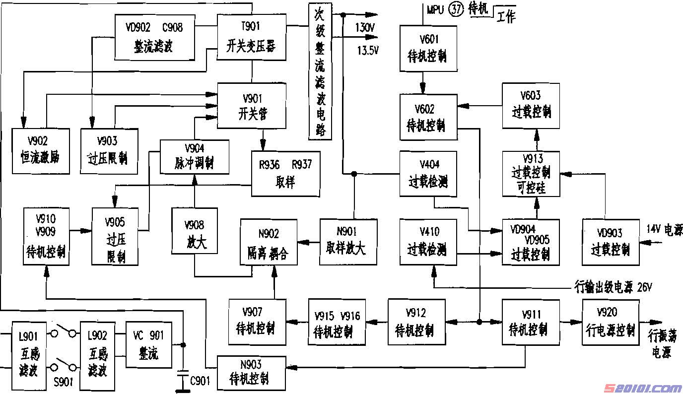 (1)V901截止期间,开关变压器T901次级绕组⑧-⑦感应电势的极性为⑧正⑦负,此时VD902导通。该感应电势经VD902整流、C908滤波,在C908上产生约5.0V的直流电压。因为C908是1000uF的大容量电容,所以在开关电源工作期间可以认为C908上的电压不变,它相当于一个直流电源,用于对V902、V910、V909等供电。[Page]