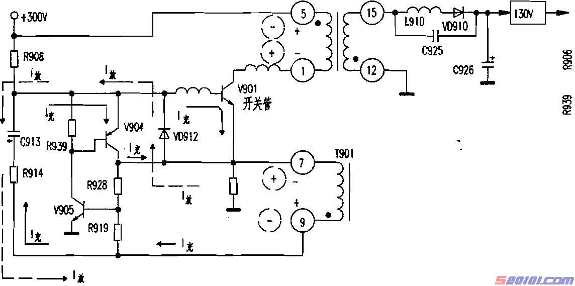 在V901饱和期间,流过T901的电流使开关变压器储存能量。同时,正反馈绕组⑨-⑦上的感应电势通过R914、脉宽脉频调制管V904及开关管V901的基极、发射极对电容C913 充电,充电电流通路如图4所示。随着C913上电压的增加,V901基极电位逐渐降低,使V901基极的注入电流逐渐减少,当Ib901<Ic901s(为V901集电极饱和电流)时,V901退出饱和。