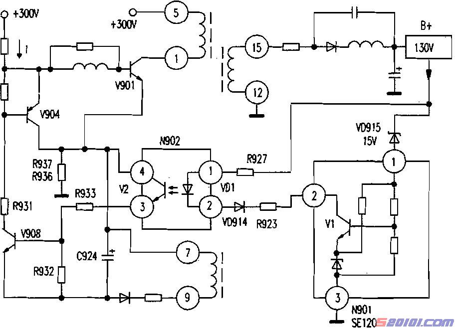 如果因负载电流变化或交流市电变化等原因,使B+(130V)电压升高,则N901内三极管V1基极电位升高。而其射极接有稳压管,电位是固定的,所以V1集电极电流Ic增加,其C极电位下降。N902内光电二极管VD1电流增加,发光增强,导致光敏三极管V2集电极电流增加,R932上电压增加,V908 基极电位上升,V908集电极电流增加,使得R939上压降增加,即V904(PNP管)发射极与基极之间的电位差增加。因而V904集电极与发射极之间的等效电阻下降,对V901基极的分流作用加强,使开关管V901的饱和导通期缩短、截止期延长,开关电源输出直流电压降低,使B+电压恢复到稳定值130V。如果因某种原因使B+(130V)电压降低,则有与上述相反的过程,