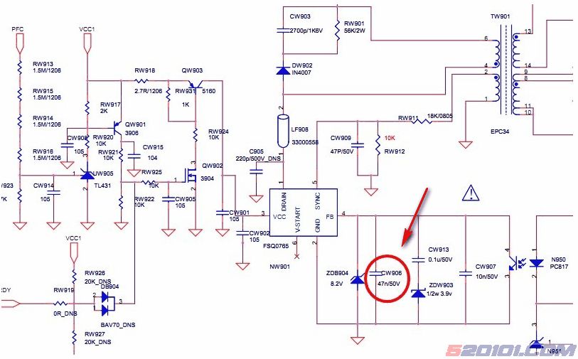 康佳LED32HS05液晶彩电绿灯闪烁不开机(图) 2017-05-16 19:44:14 阅读 508 次 评论 0 条 摘要: 康佳LED32HS05机器,电源板号是34007377,绿灯闪烁不开机,测5V电压只有3.6V,断开主板连接线,强制开机5V还是一样起不来,随即检查FSGM300供电脚电压在9V多到11V多跳变,断开QB901后,供 康佳LED32HS05机器,电源板号是34007377,绿灯闪烁不开机,测5V电压只有3.6V,断开主板连接线,强制开机5V还是一样起不来,随即检查FSGM300供电脚电压在9V多到11V多跳变,断开QB901后,供电VCC电压恢复正常,顺着思路断开去往Q0765R的VCC后5V正常,再测CW908电容105的已击穿,更换后12V正常。 附图: 版权声明:本文为转载文章,版权归原作者所有,欢迎分享本文,转载请保留出处! 点赞 分享: PREVIOUS:海信液晶电源板检修经验总结和维修实例(图) NEXT:长虹PF2163及PF25156彩电字符图像只有一半有彩色 文章导航