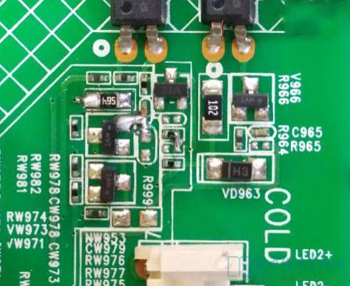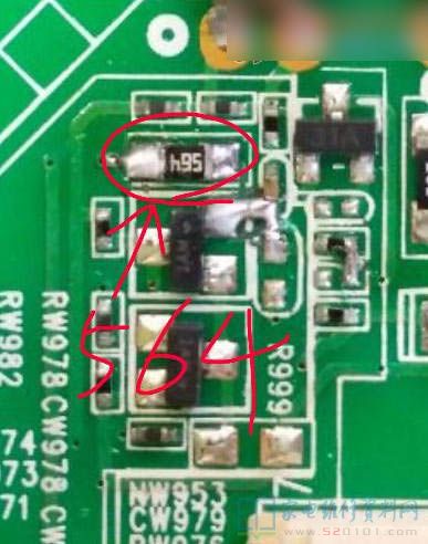 隔天插电开机,工作了两个多小时才出现问题,心想能不能单边测试呢?分别单独试了两边背光,都是开机几秒后有闪一次,之后就不闪,不可能两边灯条出现相同故障吧!难道问题不在灯条,重新思索整个测试过程,只接一组灯条就能工作,灯条全接上出现问题时把亮度调低就不闪,这不典型的带载能力差吗?是背光升压电路还是电源呢?测了下12V的那路,9V左右跳动,明显偏低,关机拔掉背光,12V供电9.3V,背光供电65V,我怎么一开始没注意电源问题呢?检查了电源取样电路,发现背光供电的取样电阻564阻值只有312k,应该就是这个问题了,为了进一步验证,找一个500k的可调电阻代换,当调低到背光供电为64V时,背光开始闪烁,终于确定故障点了,找了个514和一个513的贴片电阻串联换上,开机12V供电12.2V,背光供电86.8V,试机半天不再闪屏。