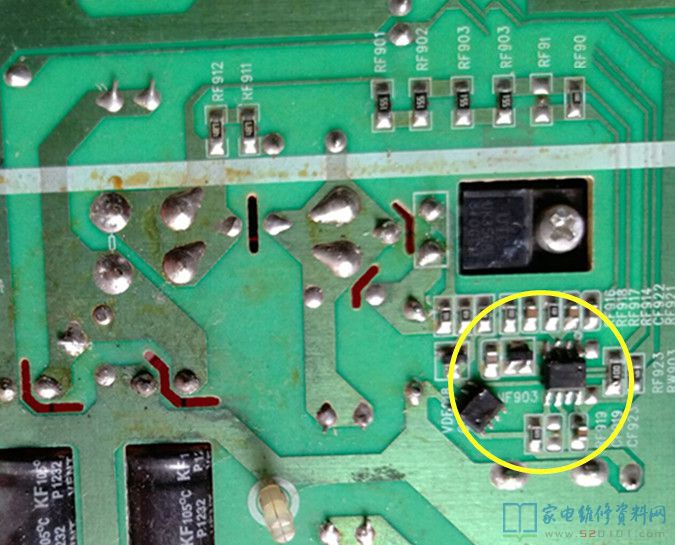 重整思路,把重点放在启动电路上。检查通病的 RW901 902 903.. 4个阻值变大先更换了(参考图纸是3个电阻,实机是4个3.3M的电阻)开机故障一样,再检查RW917 RW927没有问题。在进一步检查(1)脚发现外接的贴片电容2.2U已经没有容量或者开路。更换后输出电压正常+5.26V。