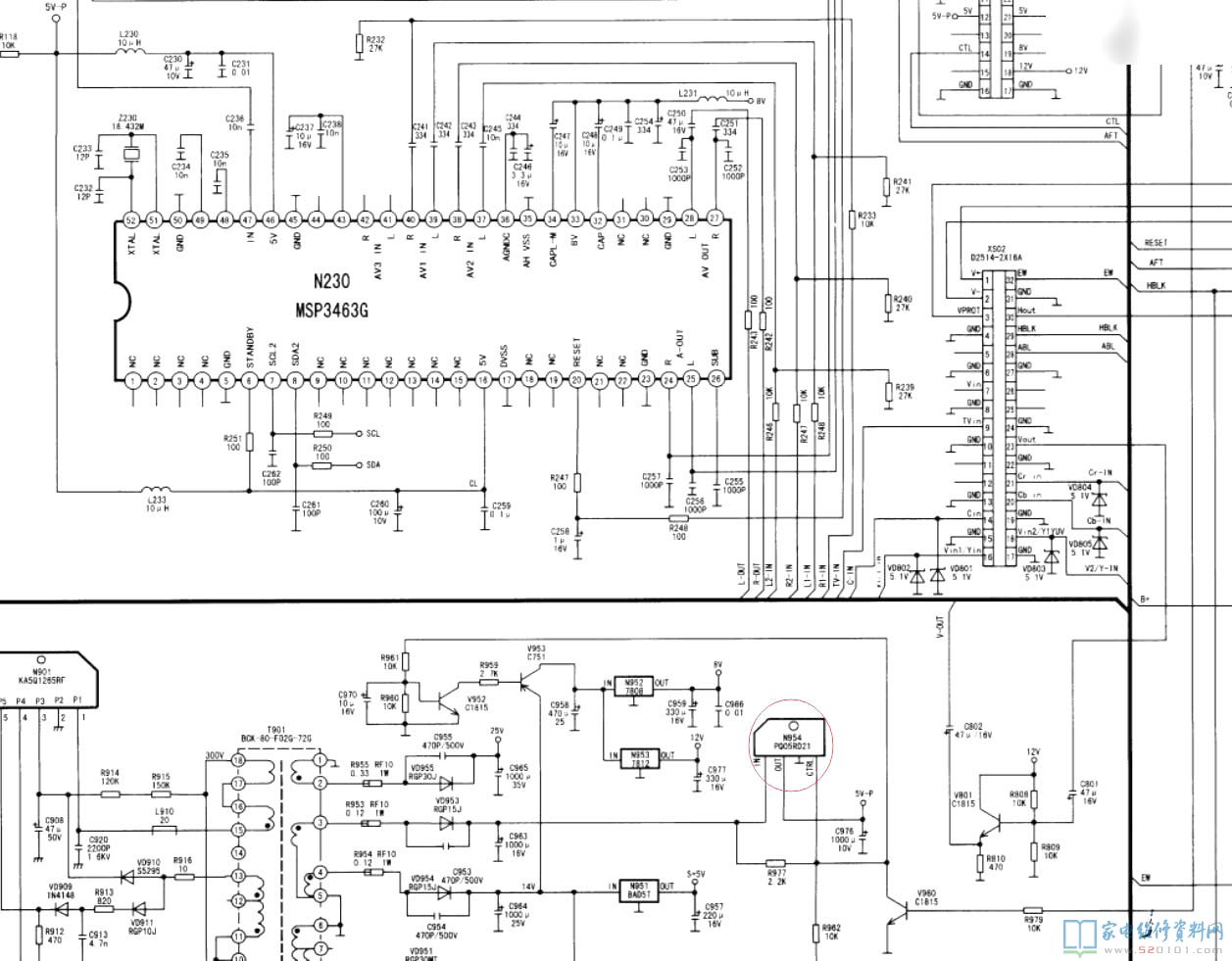 没有思路也没有空,放几天后,刚修复一台组装CRT电视也是黑屏,原因是8873跳线锈断导致55脚无5V电压造成,又搬来动动手:想到测测大块供电电压,碰碰运气,测N601 SDA555X第9.13.37.42脚=2.5V,11.44脚=3.3V,测N230 MSP3463G第33脚=8V,16.46脚没有电压,随电路走上去连到N954,一看笑了,N954中间两个脚都空焊了,补焊后N954的4个脚电压分别是:7V、4.95V、0V、5.4V,测ABL=2.65V,试机OK。历时好几天,终于搞好。