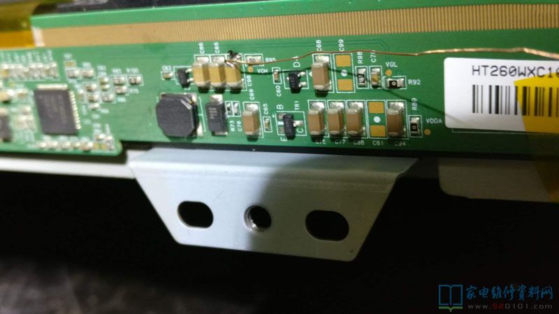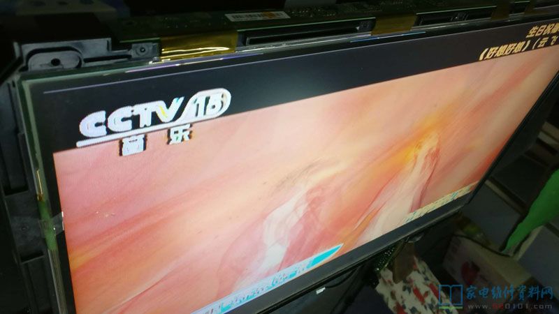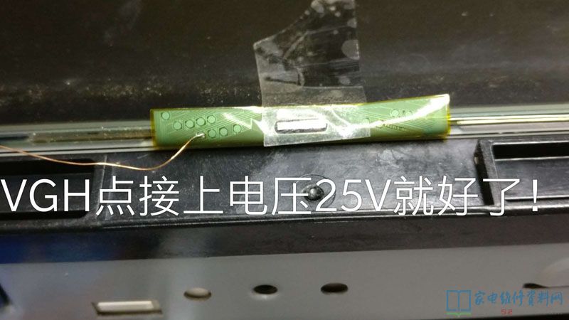 接修一台康佳液晶电视,这是一台从别的同行转来的机器,拿来上电试机时,就明白是屏出问题了。由于以前看过修此机的案例,立马拆机器,首先拆出屏边板出来,上电测量一下VGH电压有25V左右出现。这问题是屏Y轴上没有VGH电压引起的故障,所以飞线到屏耳朵上,找到VGH点连接起来就成了。找到Y轴上的VGH点,上电测此点电压,果然为0V!于是从屏边板上VGH点上引一根线,直接连到Y轴上VGH点上去,上电试机,图声正常。