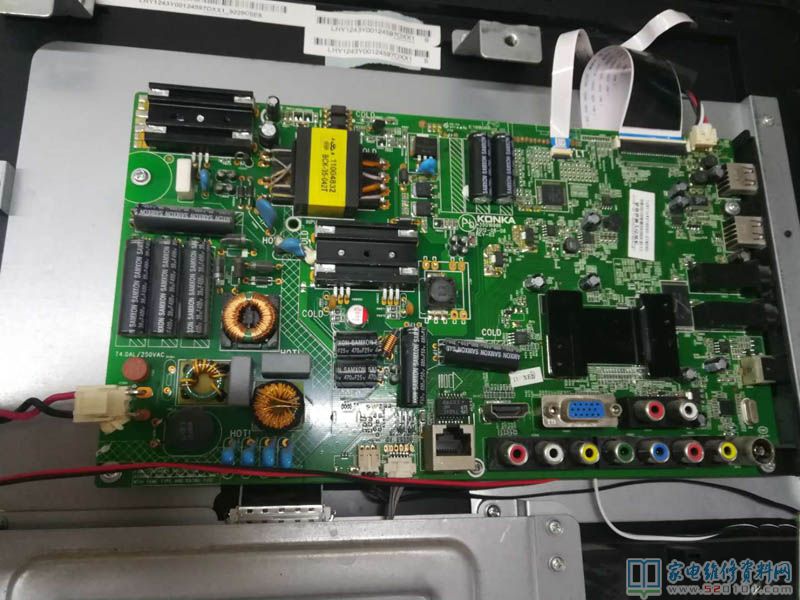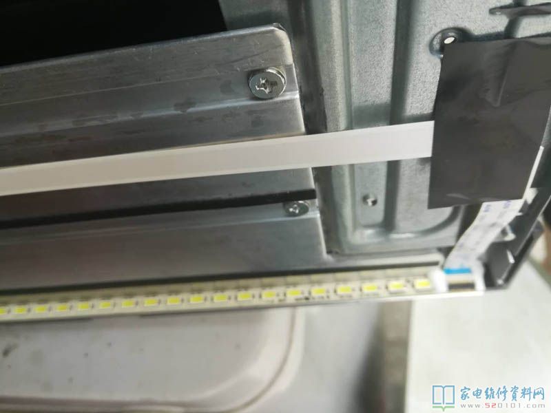 接修一台康佳LED32R5200PDE液晶电视,故障表现为开机有音乐声,初步判断故障在灯条或者升压电路故障,测升压电容C720和C750电压32.5V,灯条插座XS705第1和第12脚电压21V,基本正常,就怀疑灯条坏,和用户谈好维修的价格,开屏检查(注意这种屏是康佳商标的超薄型屏幕)维修难度比普通的LED屏难很多,拆开屏幕发现屏插线座脱落,用来一个多小时焊接好,重新小心装好。开机正常。