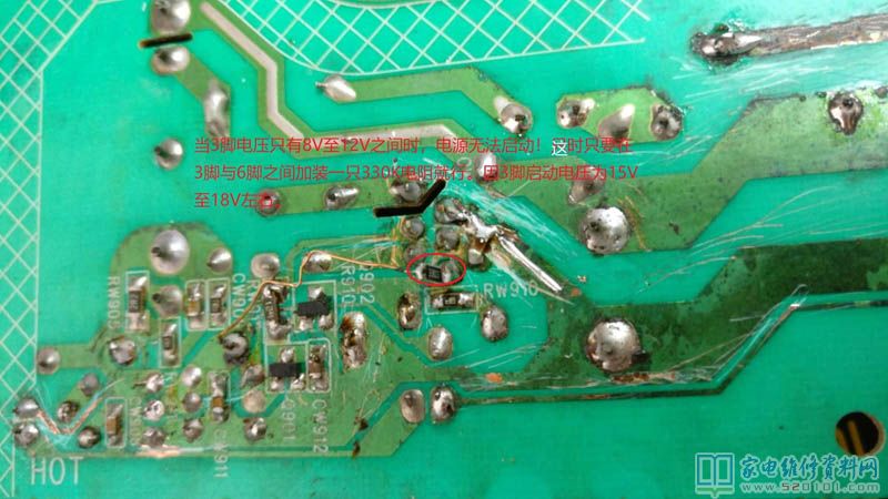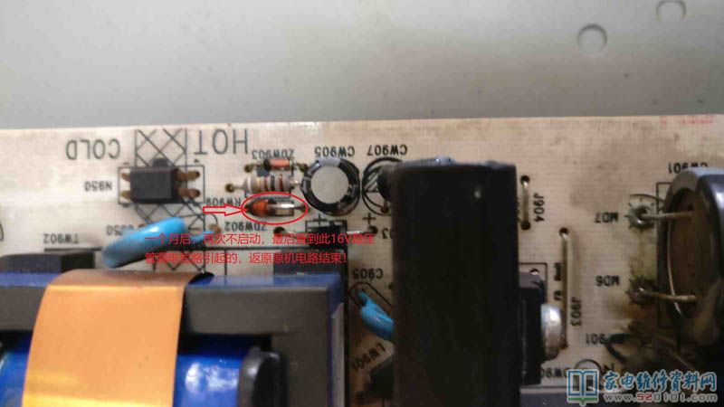 接修一台LC26ES60康佳电视,上电三无。电源板板号为34006383。拆盖测电源滤波电容290V,电源输出电压为0V。测Q0765R 3脚为低压启动端10V左右,正常应为15V左右。查相关元件正常。在这种情况下,只有技改了,于是在3脚与6脚之间串接一只330K电阻,上电试机,指示绿灯亮,蓝屏出现,上信号线图声正常。后来此机还是出现不启动现象,最终检查到ZDW902稳压管16V的,漏电短路了,换掉之后,还原好原来电路,试机最终成功。