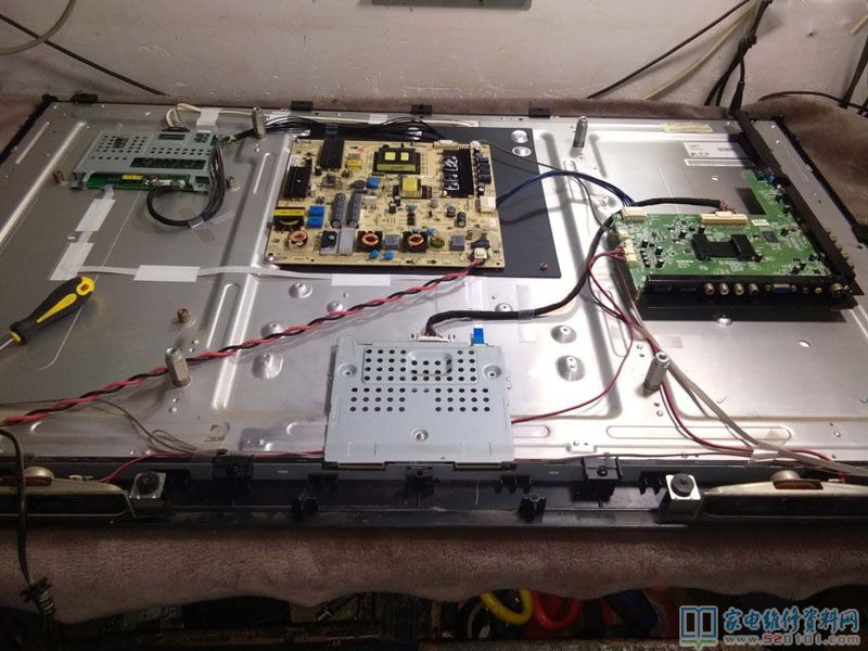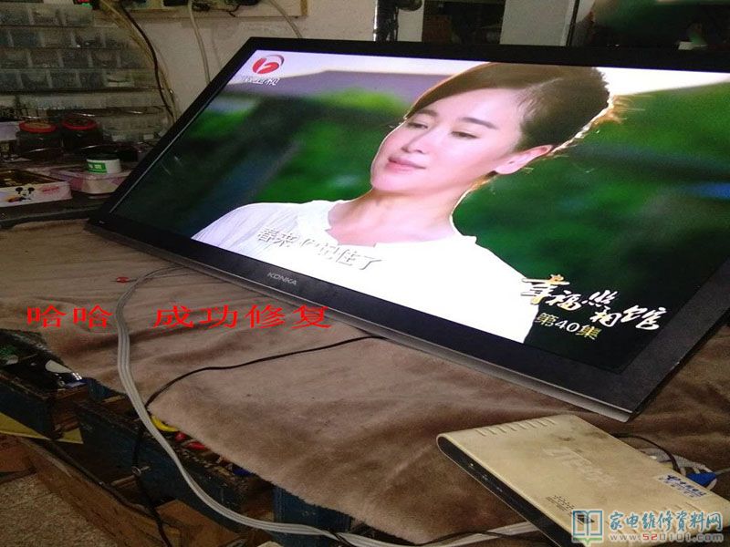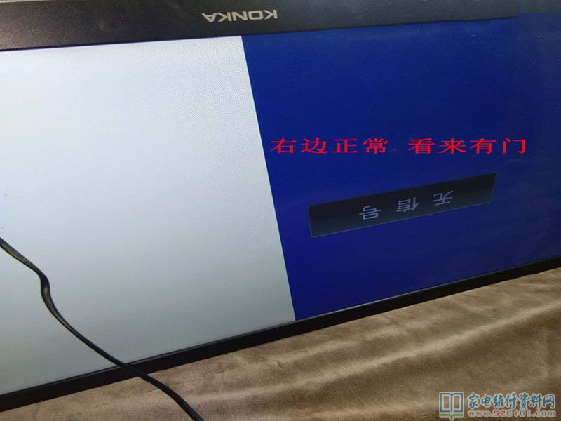 接修一台型号为康佳LED42MS11PD液晶电视,用户说有声音无图像,拿到机器,首先外观检查:有开机音乐,有背光,按键可以开关机控制,无蓝屏,无字符,灰屏。拆机检修,心想该机电源,主板应该正常,故障可能在逻辑板或屏电路。